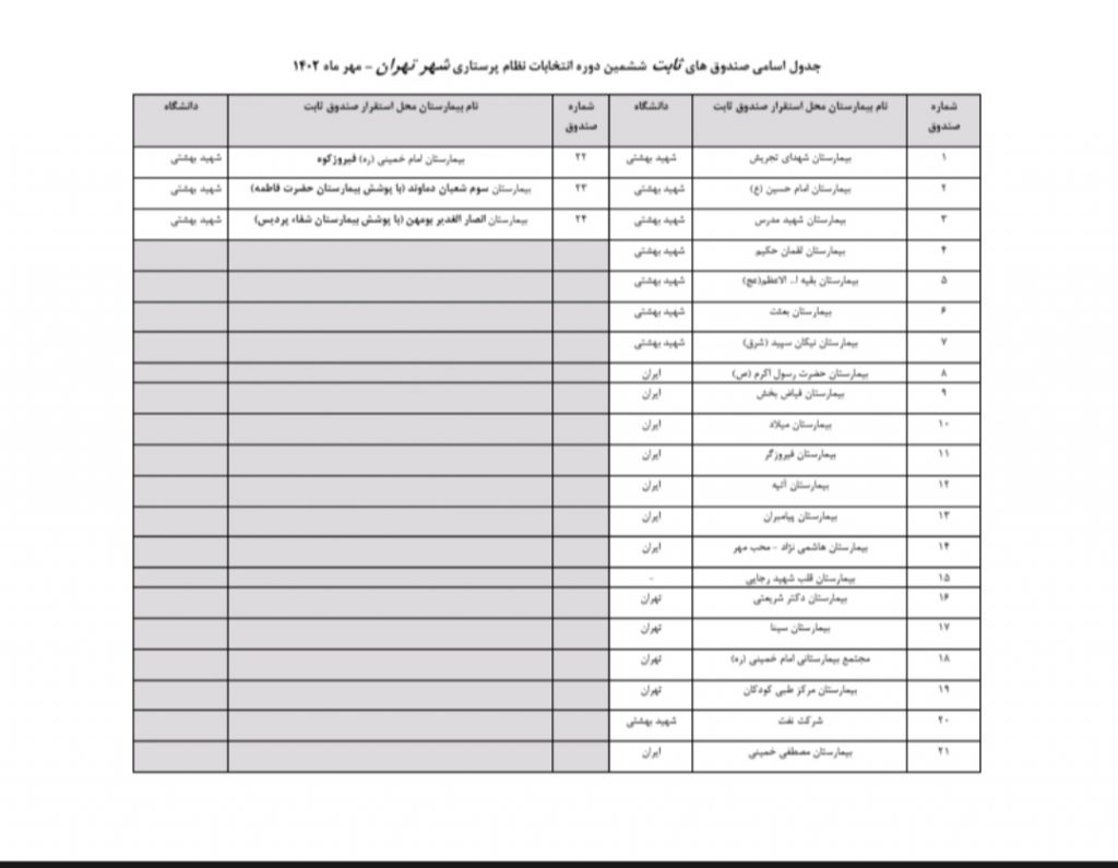 همچنین لیست صندوق های ثابت و سیار جهت شرکت در انتخابات نظام پرستاری منتشر شد